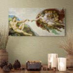 This Creation of Adam image by Michelangelo has been digitally improved which highlights the beautiful aspect of this art piece. This ensures a spectacular viewing in your home, office or religious location.