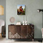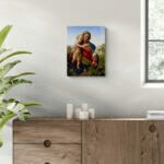 The Madonna and Child painting shows the Blessed Virgin Mary holding her precious Divine Son. The scene is full of traditional Christian symbols. The flock of sheep in the background is the customary symbol for Christian faith and worship. Lilies, the flower of the Virgin Mary, signify purity, innocence and immortality. The red roses invoke Christ’s future martyrdom, and the figs are indicative of Christ’s passion.