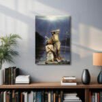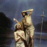 The Baptism of Christ painting depicts the moment Jesus is baptized by John the Baptist in the Jordan River. The Holy Ghost, in the form of a dove, shines down His light from above. The misty blue background of the dusky river and sky adds to the mystical element of the scene.